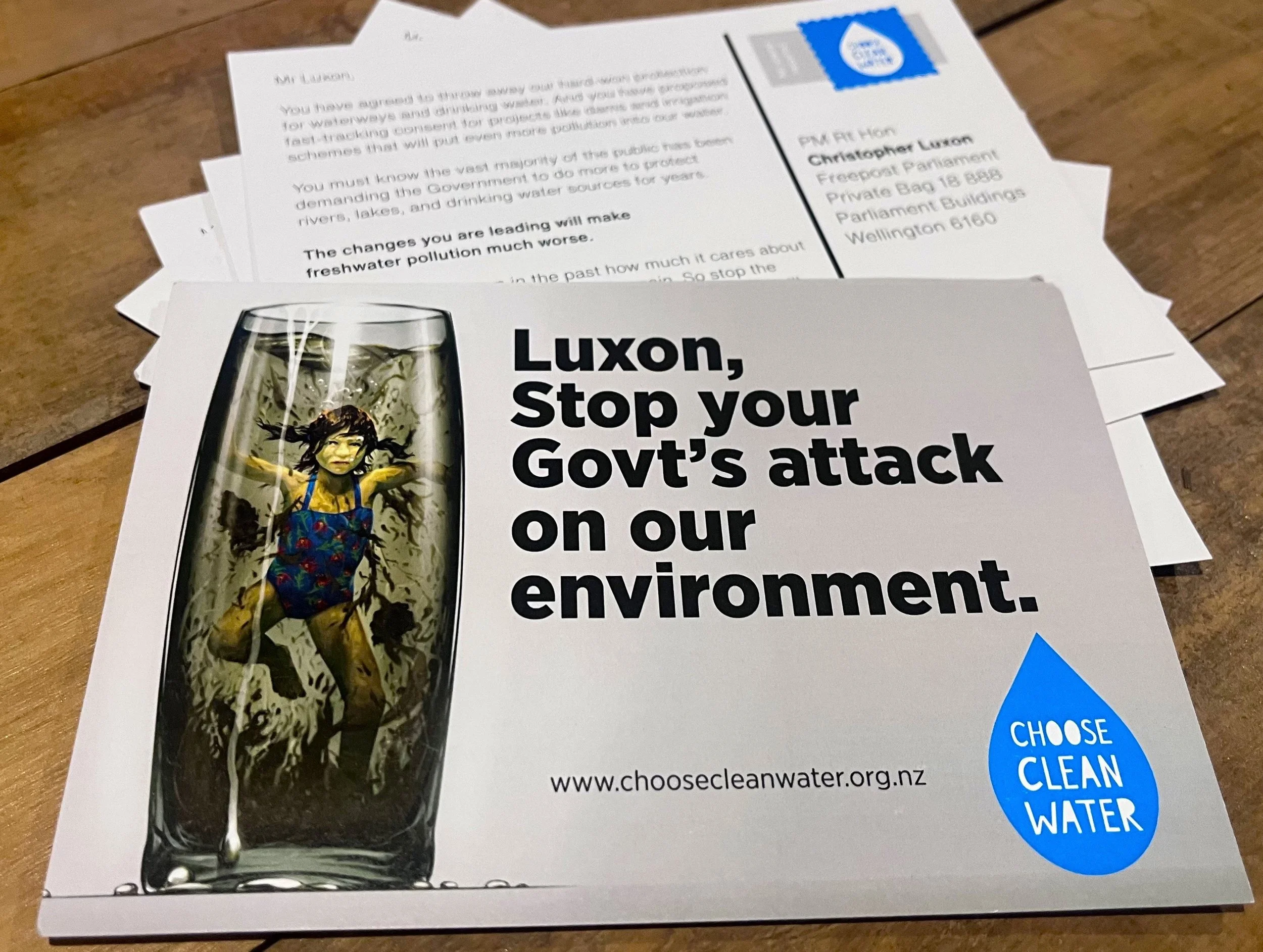 We have postcards you can send FREEPOST to Christopher Luxon to let him know that you are one of the majority of NZers who love their local rivers & lakes, & who stand against his Government's changes to do away with the legal protections the public fought so hard to win under previous Governments.